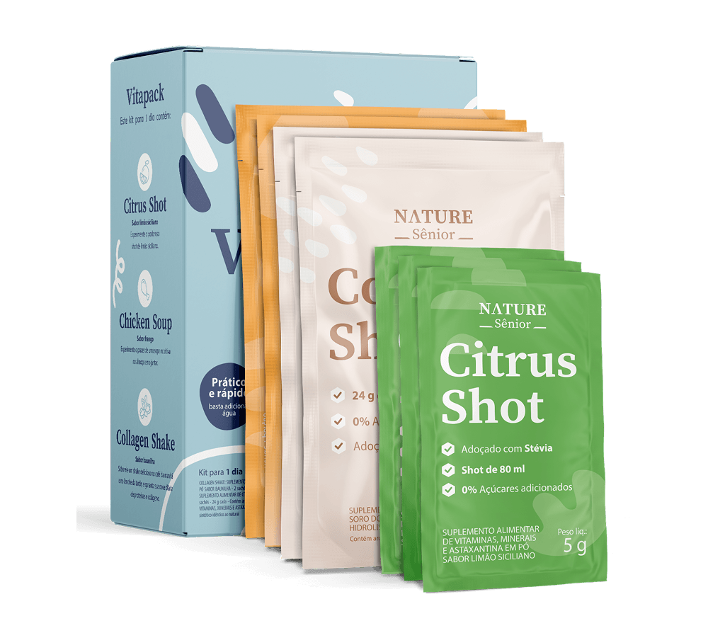 O Vitapack é um plano nutricional em sachês prontos para consumo. Cada dia reúne Citrus Shots, Collagen Shakes e Chicken Soups, com alta concentração de proteína e colágeno.